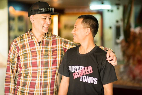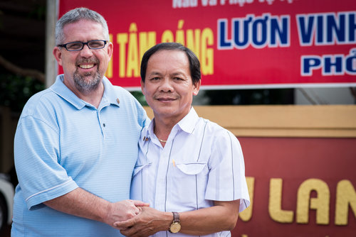 Mike Burkett with Ho Tuan Nghia after the 2 Sides Project meeting in Quang Tri. Both men share the experience of losing their father in war. They also share a love of photography.