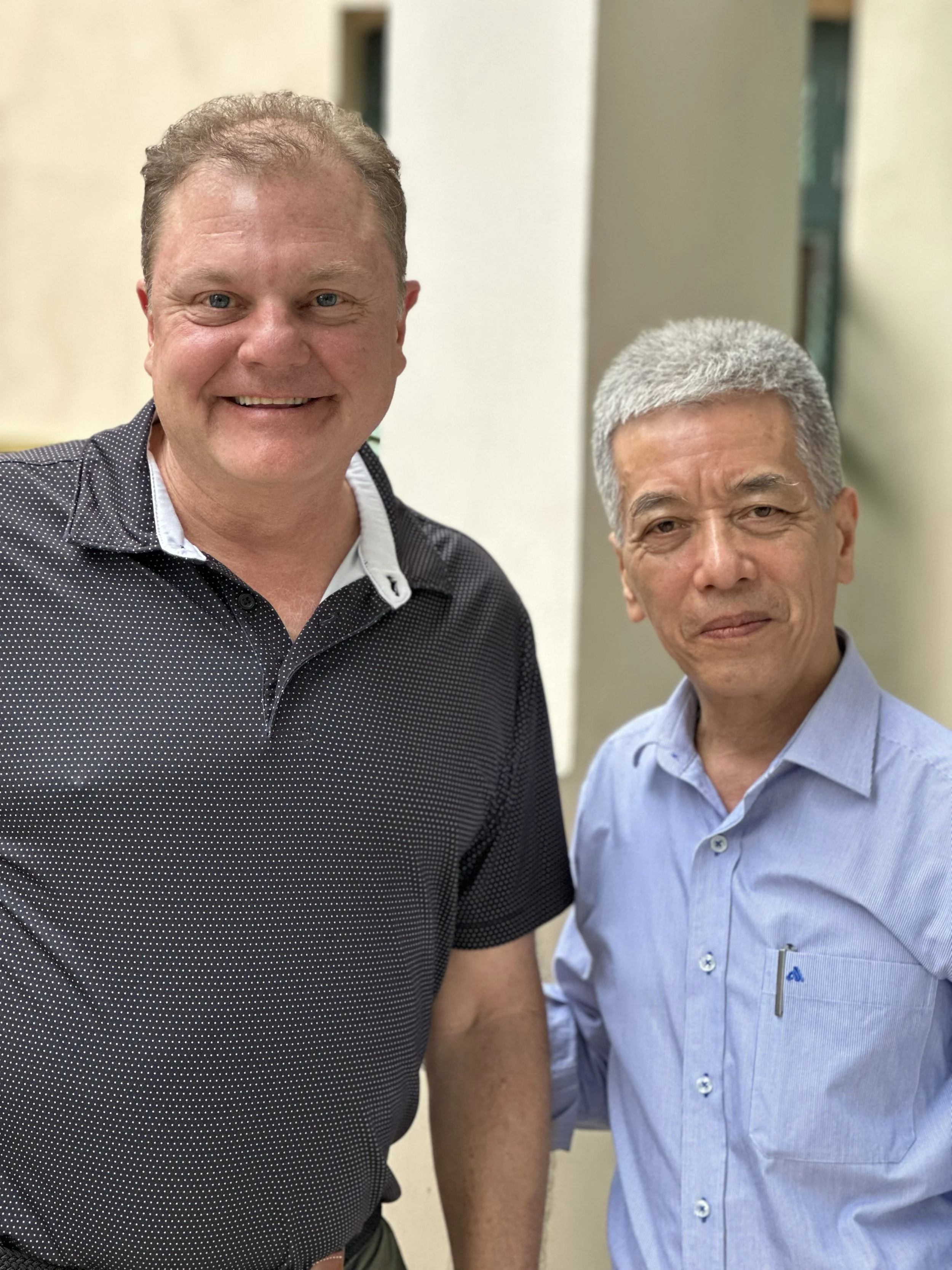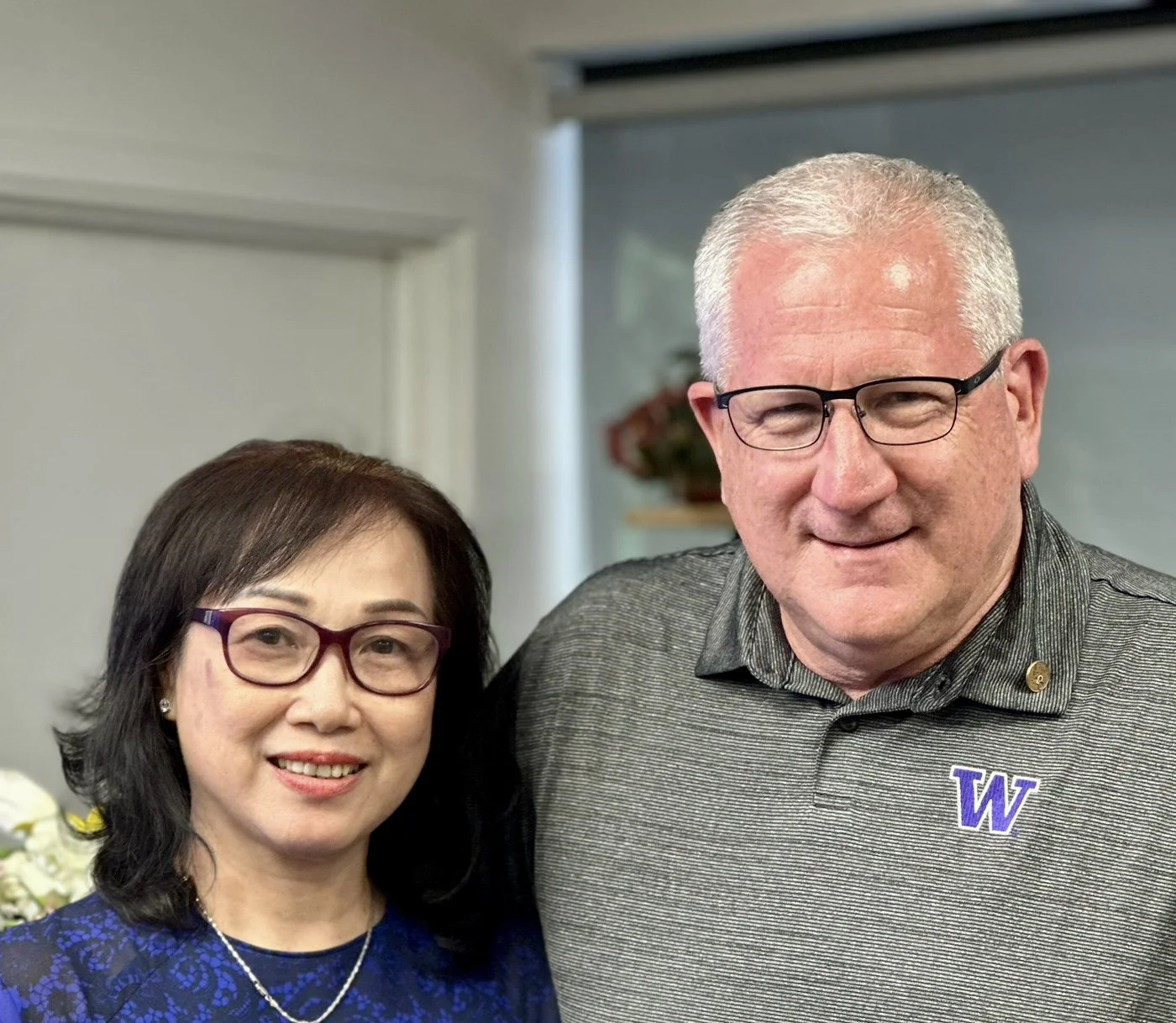 Mike and Dina with Thuy and Trung. Mike and Dina met in high school in Arizona. Thuy and Trung met in their high school in Saigon. The couples have been married ever since. They met at the 2 Sides Project meeting in Saigon, January 2024.