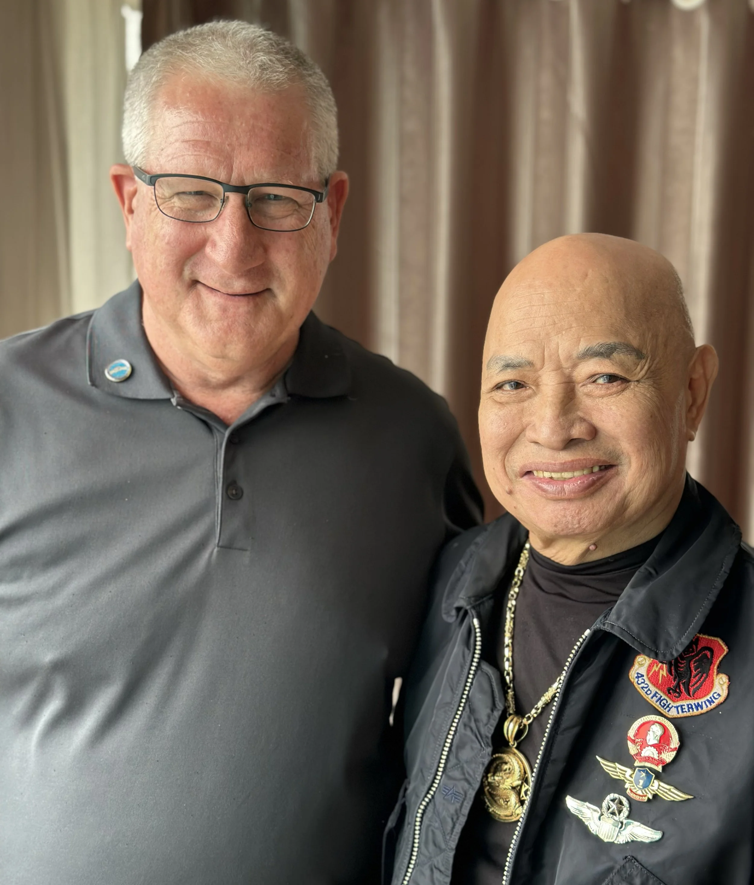 Doug Godfrey, the son of Air Force Captain Johnny Godfrey, stands with the decorated Vietnamese pilot Nguyen Hong My. Doug read about My before going to Vietnam and was impressed with his extraordinary story both during and after the war. My was shot down by F-4D Phantom pilot Major E. Daniel Cherry and survived. Decades later, the two men met in Vietnam. They became good friends who were able to put the war behind them. Doug read something My said that stuck with him: the Vietnamese, My siad, are a peace loving people. Doug was able to meet with My and connect over a peace-focused