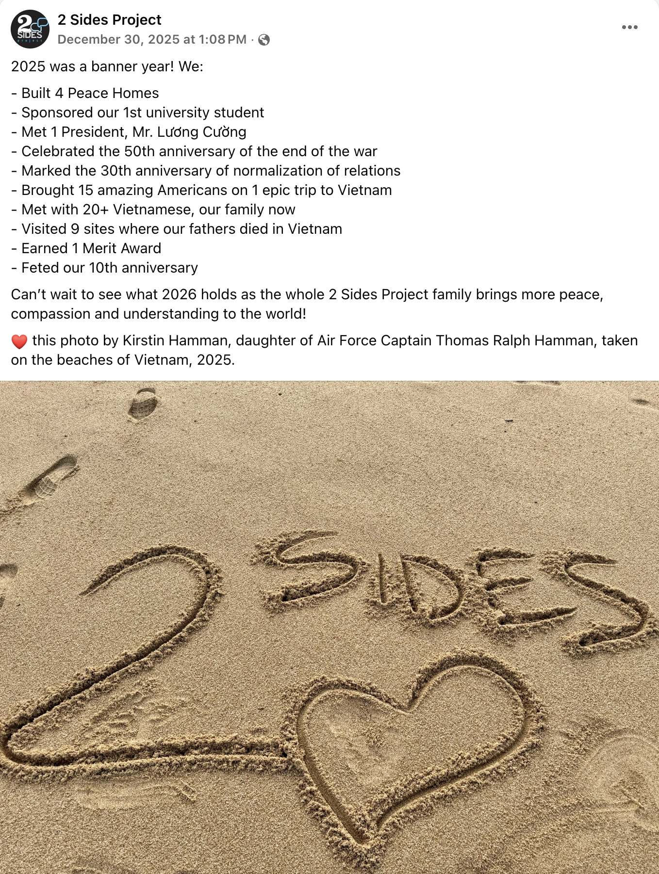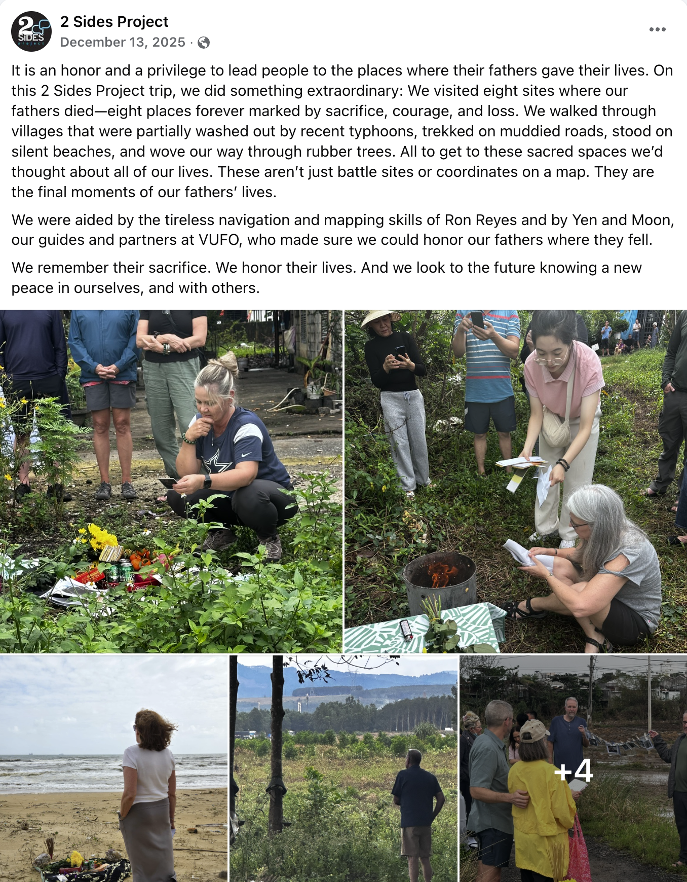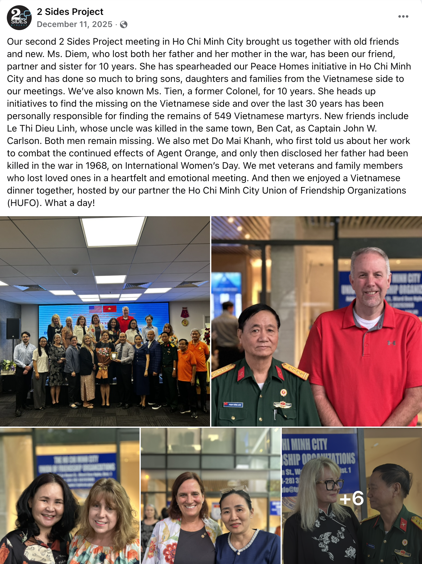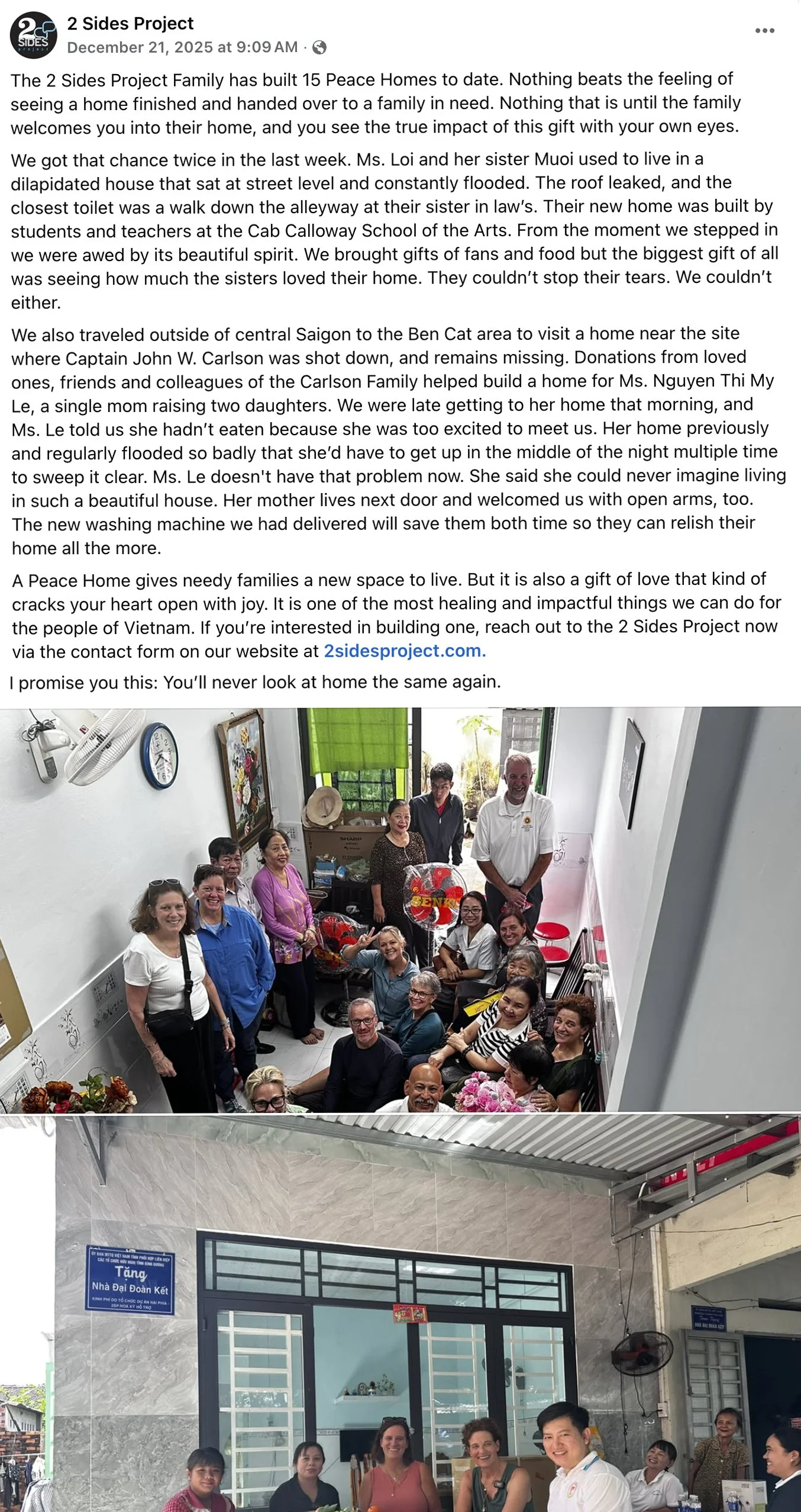 2 Sides Project) and her sister Pamela are reflecting on the 50th anniversary of their father's death by looking ahead. They have pledged to build the first “Peace Home” in the province where their father died, to be given to a needy family. This home is a pilot project with the 2 Sides Project’s partner in Vietnam, The Vietnam USA Society (VUS), and is the first of other programs that we hope to develop with partner organizations, so that we can not only foster connections between the two sides, but develop a positive outcome for future generations.